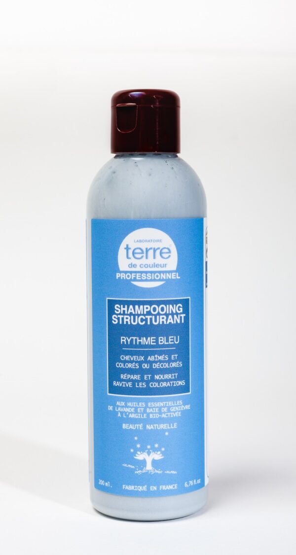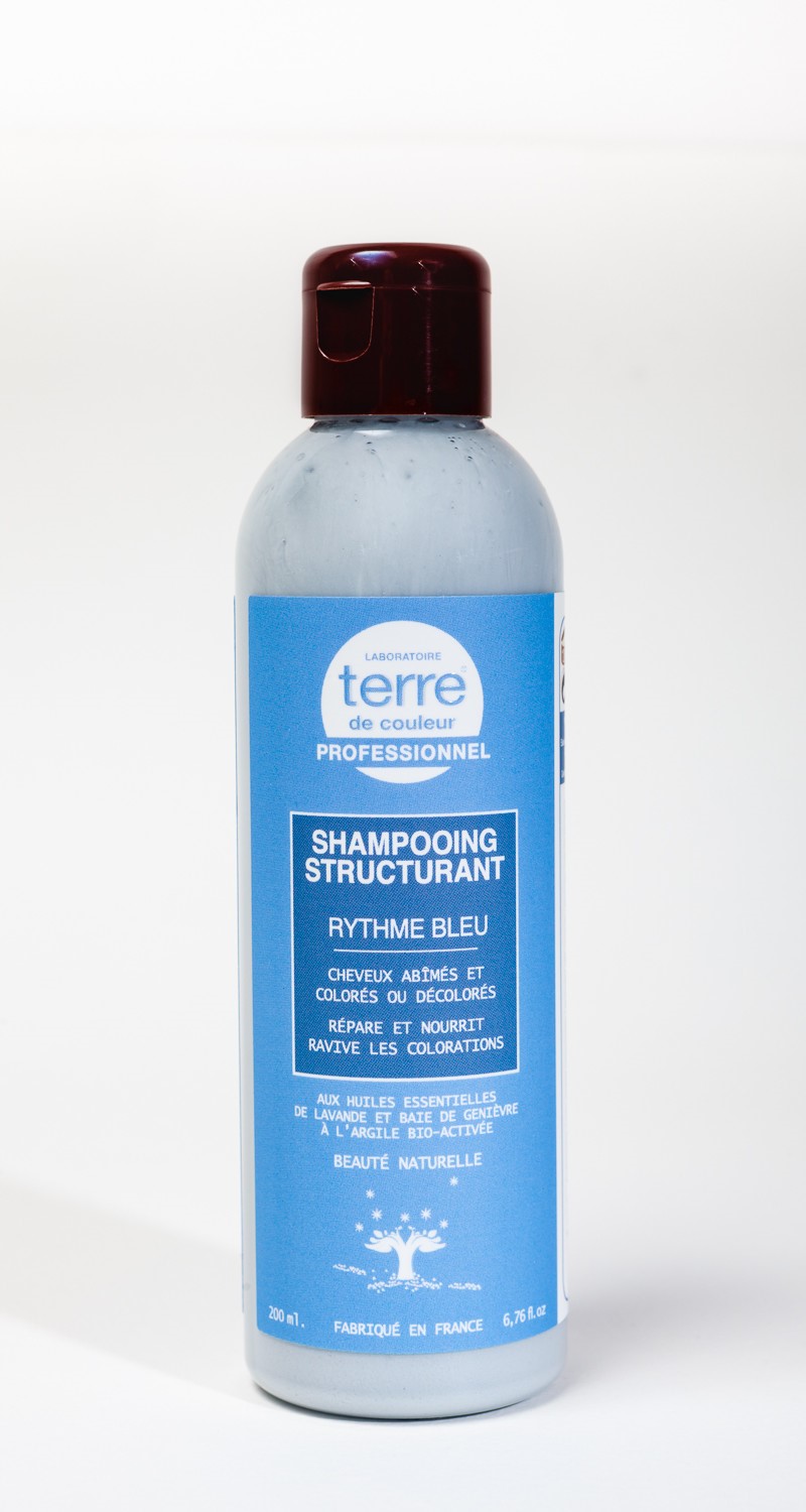 - Le Shampooing Structurant Rythme Bleu de la gamme Terre de Couleur Professionnel complète l’action du Masque Structurant Rythme Bleu, destiné aux cheveux abîmés, affaiblis, sans consistance ni éclat. Réparateur et nourrissant, il permet également de raviver les colorations, qu’elles soient chimiques ou végétales.